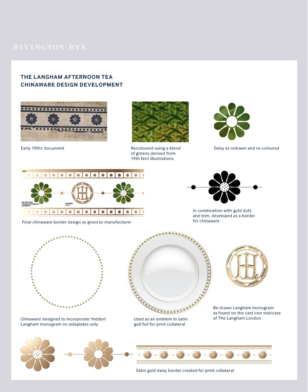 Using a daisy motif in a blend of greens taken from early 19th century fern illustrations – which chimed well with the original Langham monogram from the ironwork of its staircase, in combination with gold detailing, we created a new chinaware pattern for William Edwards bone china to manufacture.
